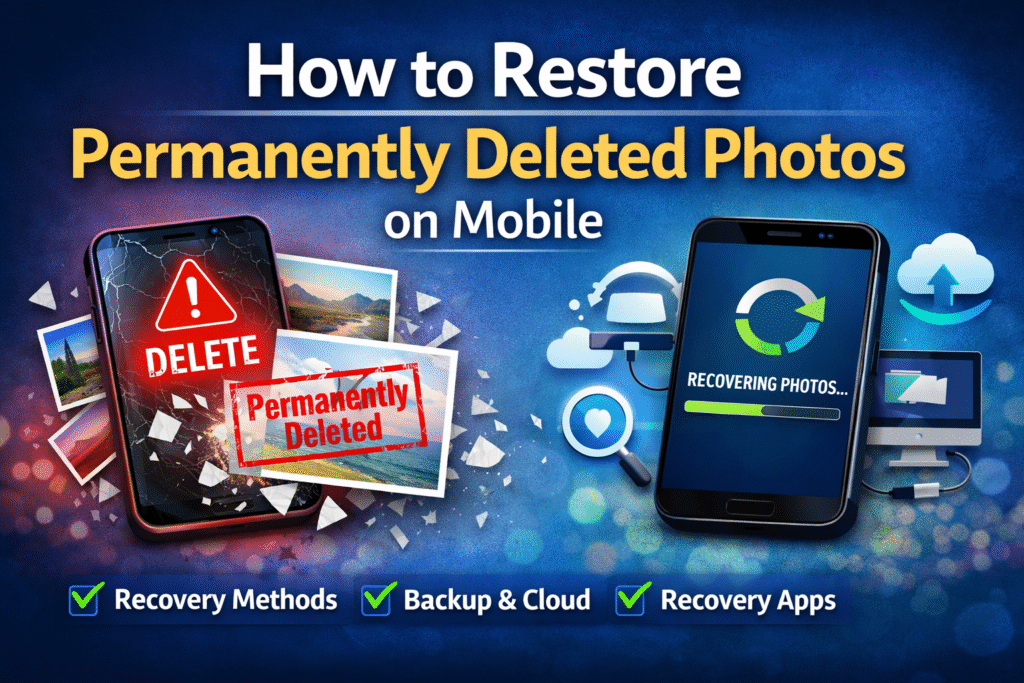 - How To Restore Permanently Deleted Photos In Mobile (2026 Guide)by DigiblissLosing important photos from your mobile phone can be frustrating, especially when they are permanently deleted. Whether it’s personal memories, work files, or important screenshots, many people assume … Read more