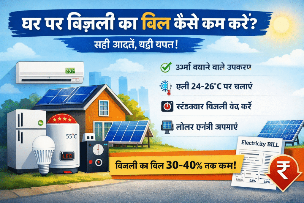 - घर पर बिजली का बिल कैसे कम करें (आसान और उपयोगी गाइड)by Digiblissआज के समय में बिजली का बिल हर घर के मासिक खर्च का एक बड़ा हिस्सा बन गया है। एसी, फ्रिज, वॉशिंग मशीन, टीवी और अन्य उपकरणों के बढ़ते उपयोग के कारण कई लोगों को हर महीने ज्यादा बिल आने की चिंता रहती है। लेकिन अच्छी बात यह है कि कुछ आसान आदतें अपनाकर और … Read more