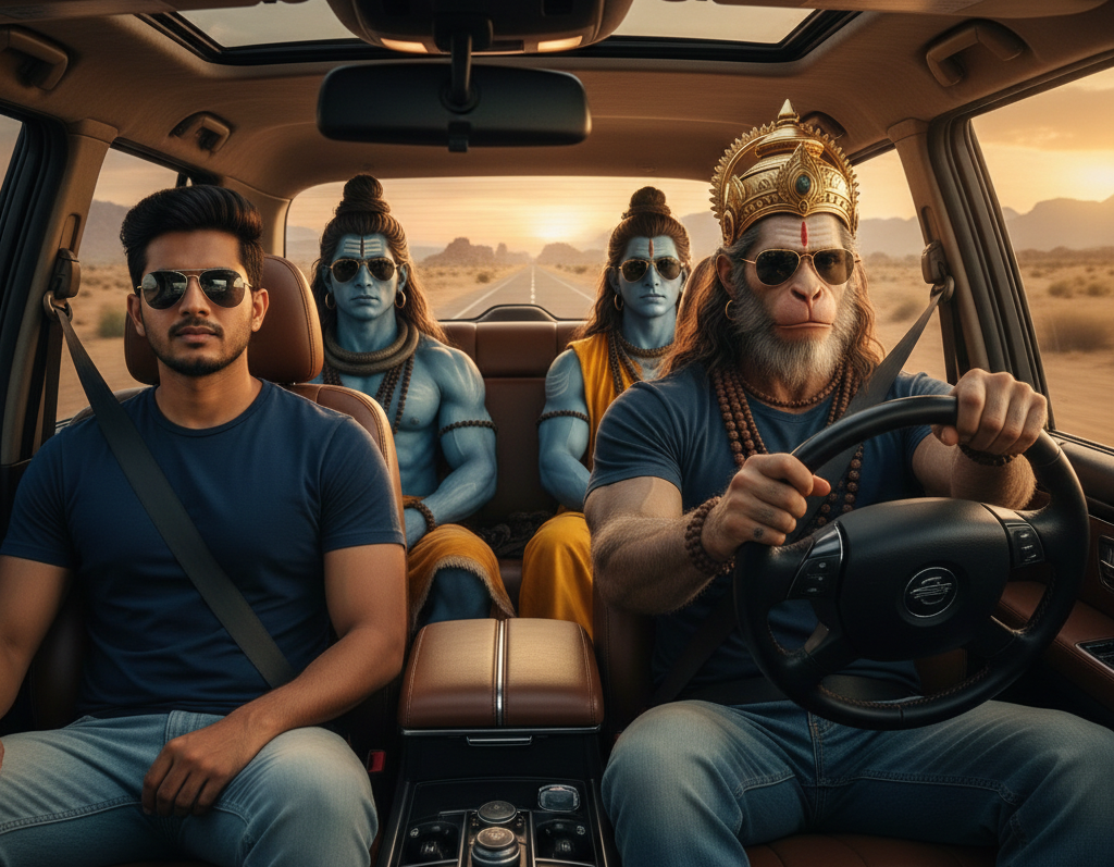 A cinematic, ultra-realistic shot taken from the front view (windshield angle) looking inside a modern luxury SUV during a golden hour sunset. The main subject is a young Indian man [reference image] sitting in the driver’s seat, wearing a light blue shirt and stylish black sunglasses, looking cool and relaxed. Seated in the passenger seat is Lord Hanuman in a divine human form with a powerful physique and golden ornaments. In the back seat are Lord Shiva (with ash marks and rudraksha beads) and Lord Krishna (with a peacock feather crown). All the gods are also wearing stylish black sunglasses, blending a modern vibe with a divine aura. The car windows are open, and warm sunlight floods the cabin. 8K resolution, photorealistic skin texture, sharp focus, natural shadows, and highly detailed reflections.Copy to Clipboard.