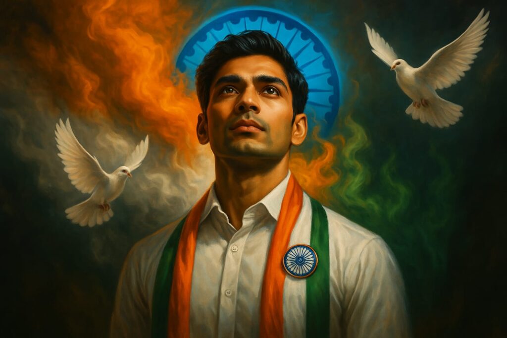 A POWERFUL PATRIOTIC PORTRAIT OF A YOUNG INDIAN MAN (SAME PERSON AS IN IMAGE) LOOKING UPWARD WITH PRIDE AND HOPE. HE WEARS A CRISP WHITE SHIRT ADORNED WITH A TRICOLOR SCARF (ORANGE, WHITE, AND GREEN) AND AN ASHOKA CHAKRA BADGE. BEHIND HIM, THE INDIAN FLAG’S SWIRLING SMOKE FORMS A VIBRANT BACKDROP WITH THE BLUE ASHOKA CHAKRA HALOING HIS HEAD LIKE A SYMBOL OF UNITY. TWO WHITE DOVES FLY BESIDE HIM, REPRESENTING PEACE AND FREEDOM.